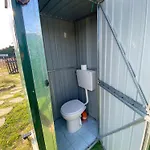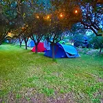 Il campeggio comprende una zona pranzo all'aperto con un frigo e utensili da cucina.